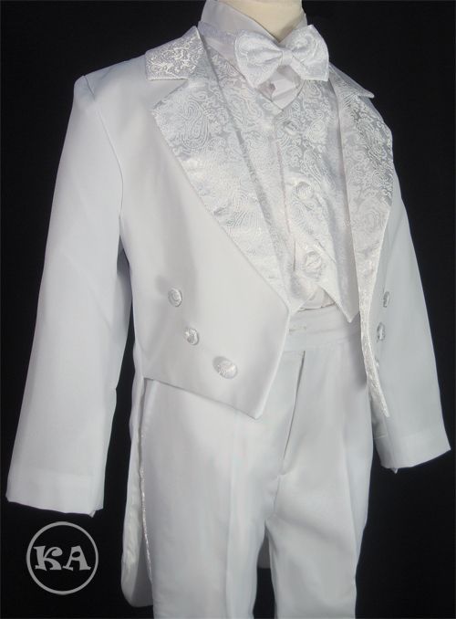 This boys tuxedo includes jacquard notch lapel jacket, dress shirt, dress pants, vest and matching bow-tie.