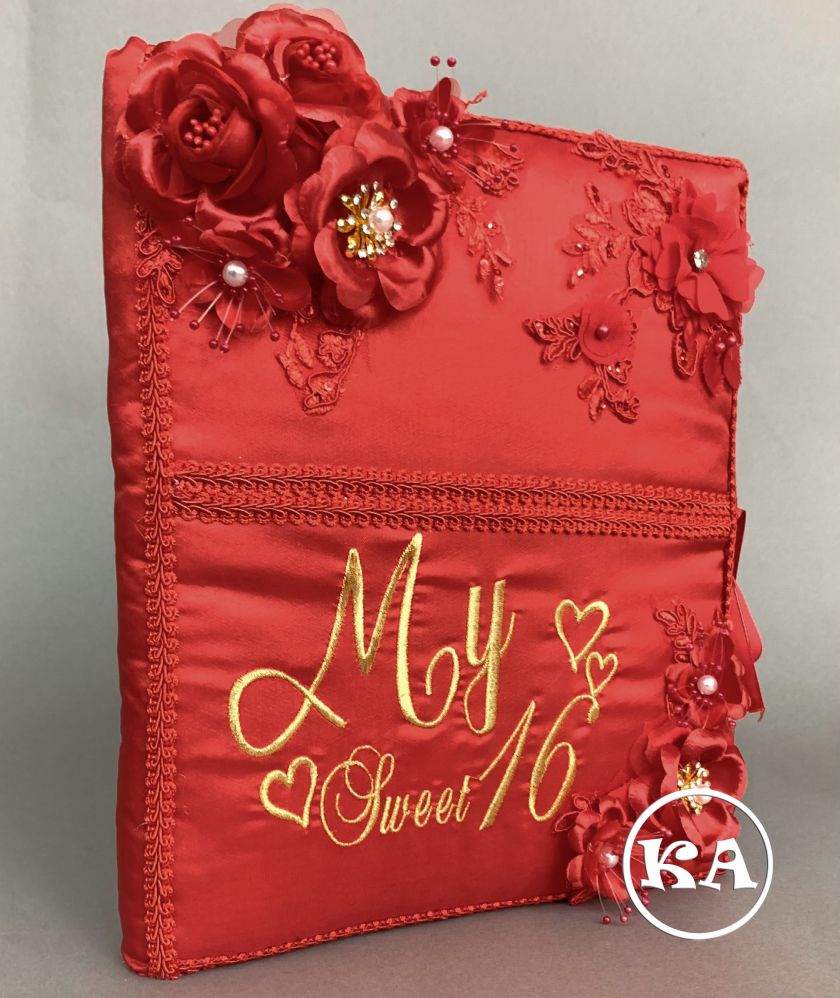 An album is an excellent way to display your photos and remember the fun times you had on your quinceanera fiesta. Here we have one with lavish satin lace and fine embroidery of a princess. It's available in many colors and can be personalized. Enjoy!